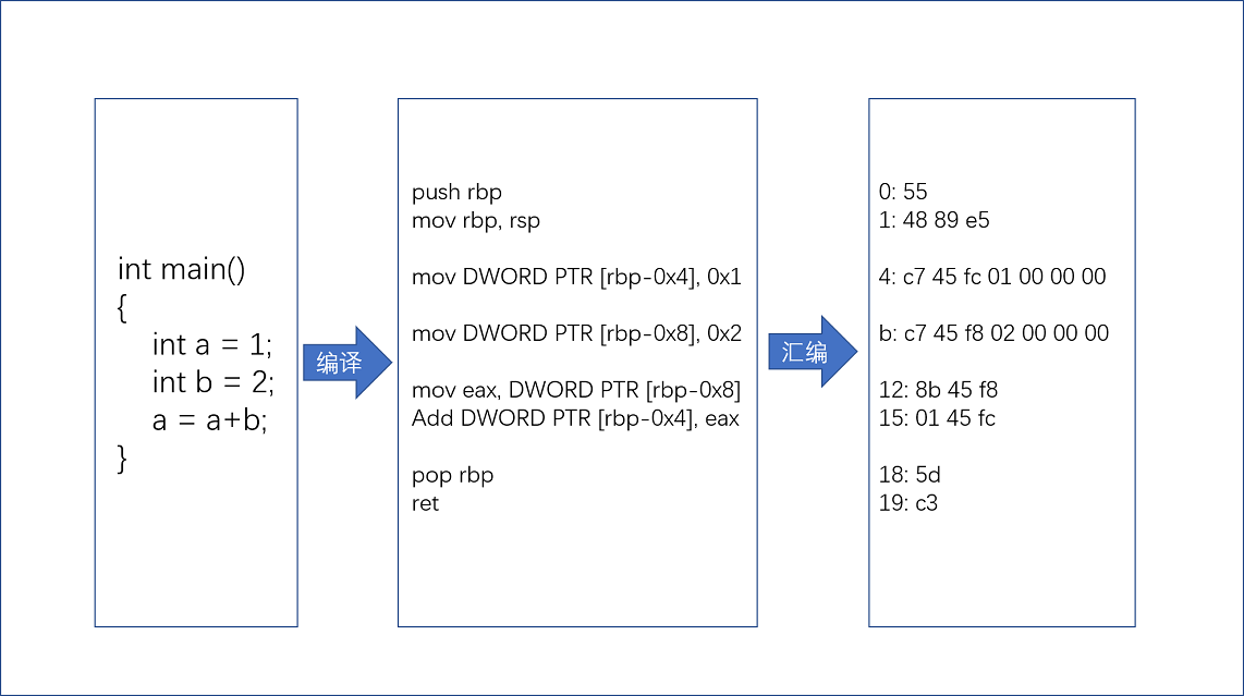 在Linux 操作系统上,可以简单地使用 gcc 和 objdump 这样两条命令,把对应的汇编代码和机器码都打印出来。
